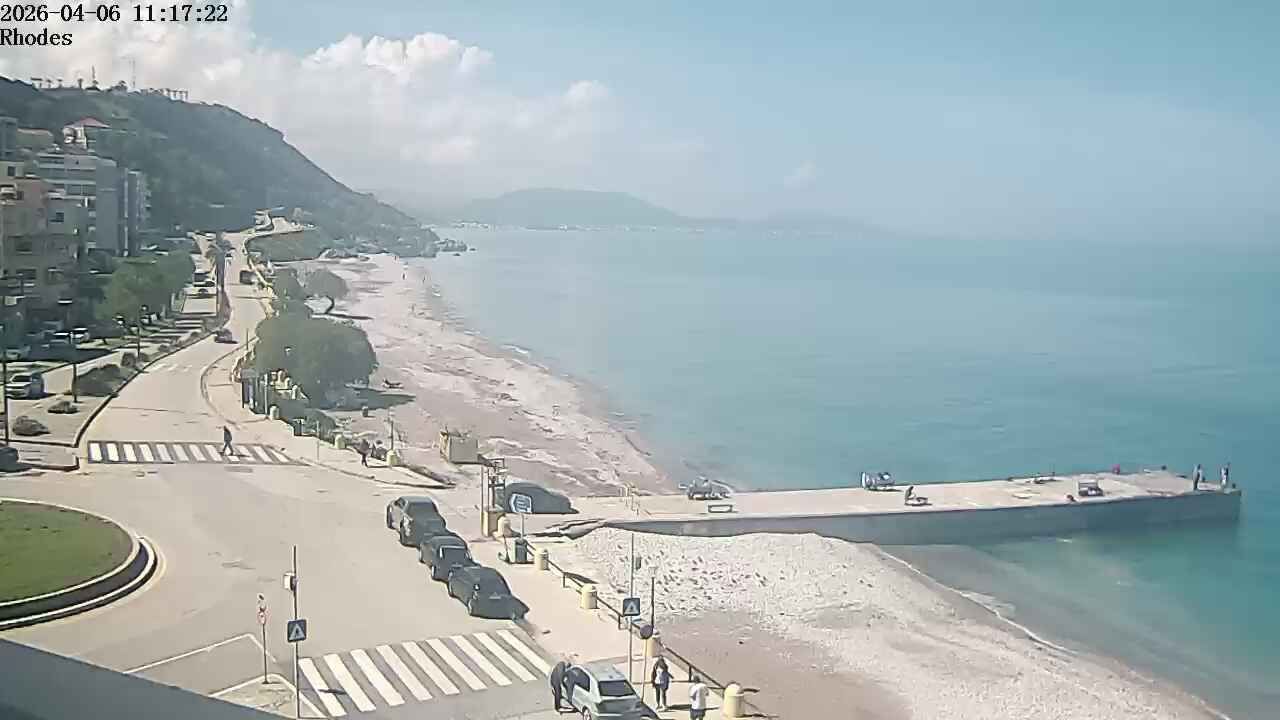 live view over the popular beach located on the northwest coast of the Greek island of Rhodes,known for its crystal-clear waters and great conditions for windsurfing, webcam hosted by Pizzeria da Gilberto.